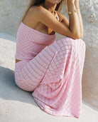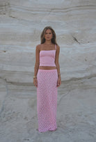 تجمع هذه المجموعة النسائية بين بلوزة بدون حمالات وتنورة طويلة مخططة باللونين الوردي والأبيض. تصميمها السائل والخفيف يجعلها ملابس مثالية لأيام الشمس. مثالية لمناسباتك الصيفية، تجمع بين الراحة والأناقة بأسلوب.