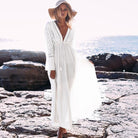 تقدم هذه الفستان الأبيض الطويل قصة سلسة وواسعة لراحة مثالية. يضيف خط العنق العميق والتفاصيل المطرزة لمسة من الأنوثة. مثالية لليالي الصيف، تتناسب مع جميع المناسبات.