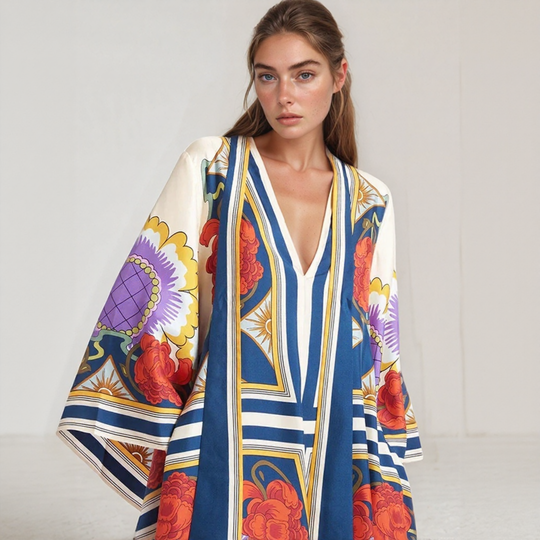 • نقوش زهرية وهندسية جريئة لأسلوب فني فريد.