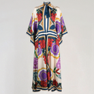 تتميز هذه الفستان الطويل بنقوش زهرية جريئة وقصة انسيابية. يضيف طوقها المرتفع مع تفاصيل العقدة في الظهر لمسة من الأناقة المتطورة. مثالية لجميع الفصول، توفر أناقة بوهيمية خالدة.