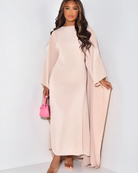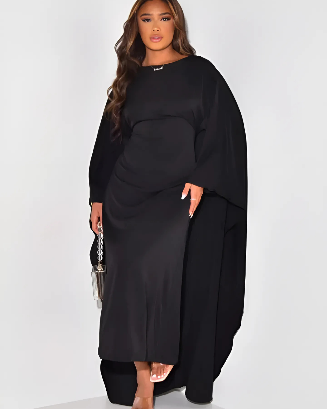 تجسد هذه الفستان الطويل الرشاقة والأنوثة مع قوام سائل وتفاصيل متقنة. يضيف ياقة دائرية كلاسيكية وأكمام مكسوة لمسة من الرقي مع نعومة. مثالية للحفلات، العشاء الرسمي أو الأمسيات الأنيقة.