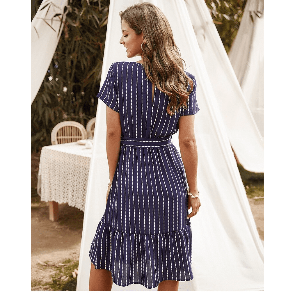 With its navy blue hue, V-neckline, and knotted belt, this short dress perfectly reflects the hippie chic spirit. Its asymmetrical cut adds a delicately modern touch. Ideal for a romantic evening or a summer getaway.
