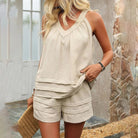 Ez a ujjatlan, V nyakú szett ötvözi a kényelmet és az eleganciát, laza szabásával. Ideális a nyári napokra, egyszerűen laza és stílusos megjelenést kínál.
