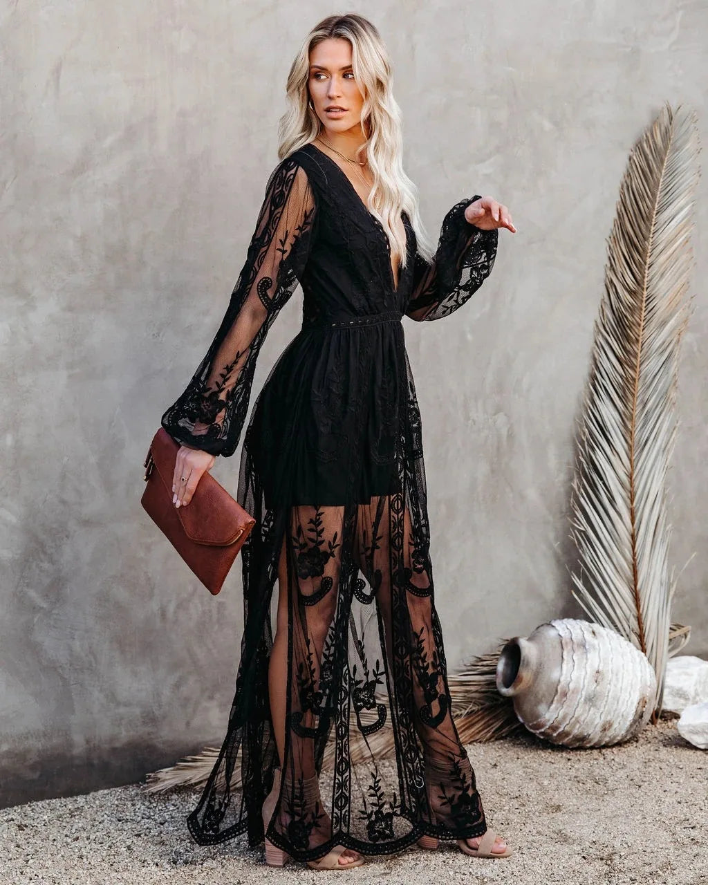 ヴェラ | モダンでスリムなシルエットの刺繍入り黒のロングドレス