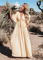 この流れるようなロングドレスは、ゆったりとした軽やかなシルエットを提供します。深いVネックがシルエットを引き立てます。夏の日やエレガントな夜にぴったりです。