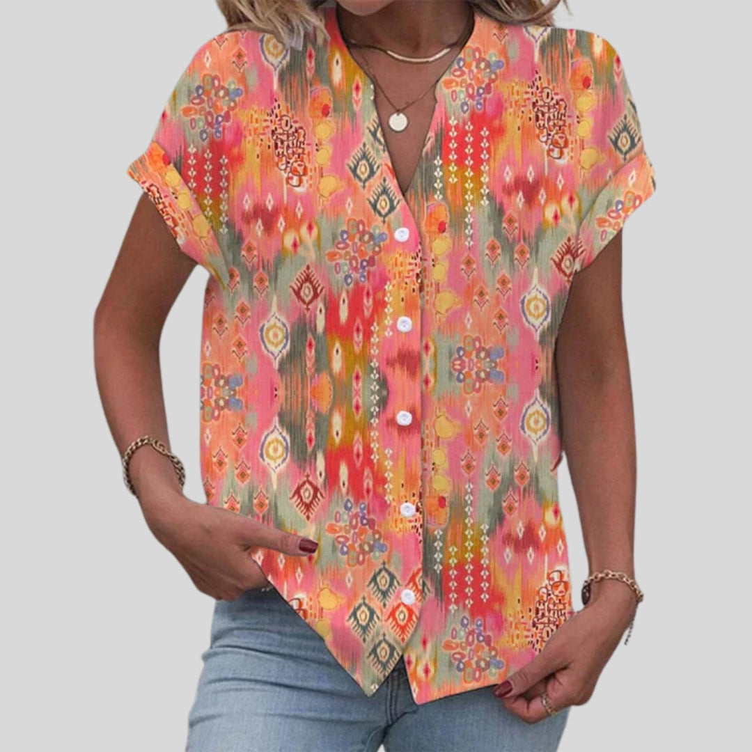 このエレガントなブラウスは、鮮やかなボヘミアンプリントを特徴としています。ゆったりとしたカットとVネックで、最適な快適さを提供します。さまざまな場面にぴったりで、異なるボトムスと簡単に組み合わせられます。