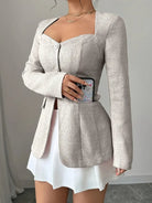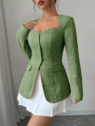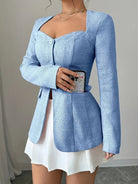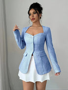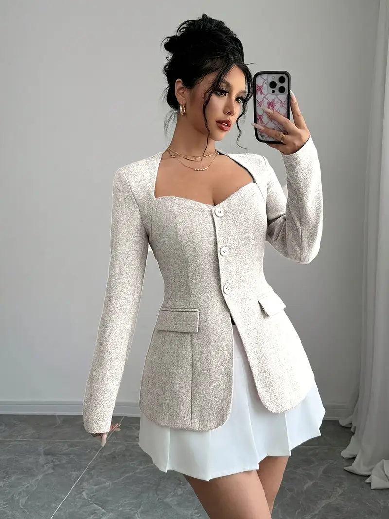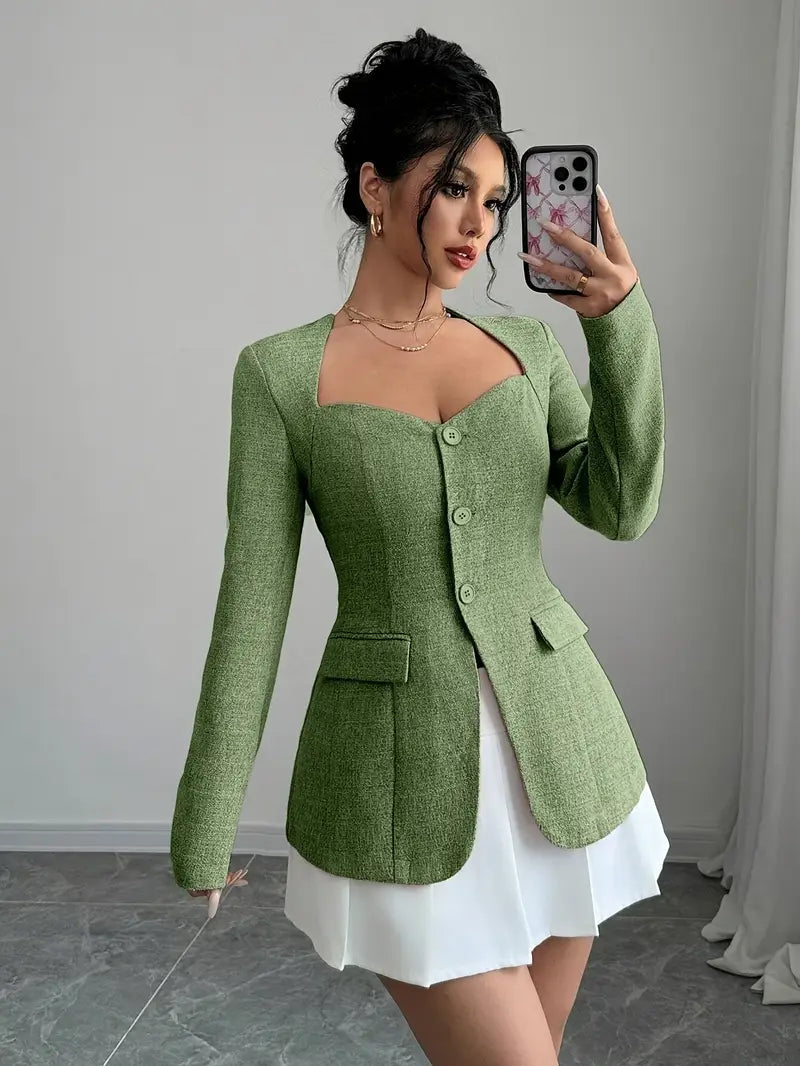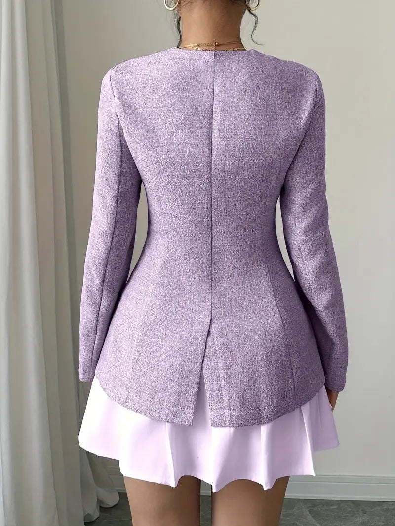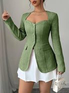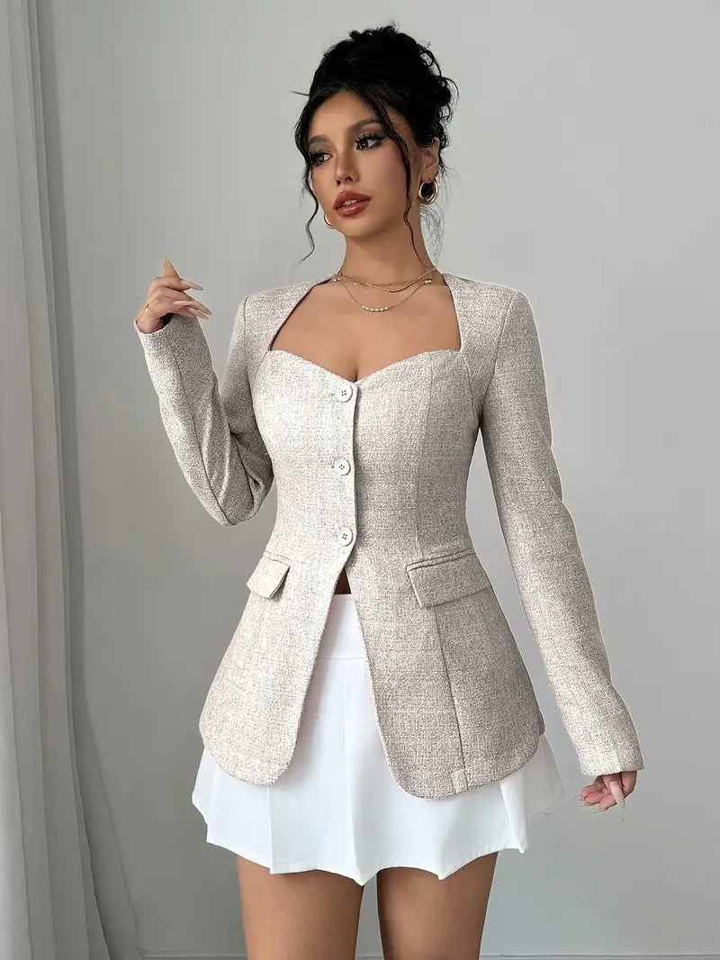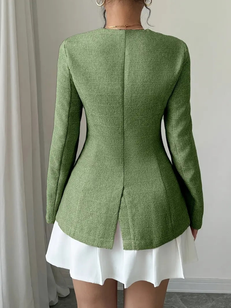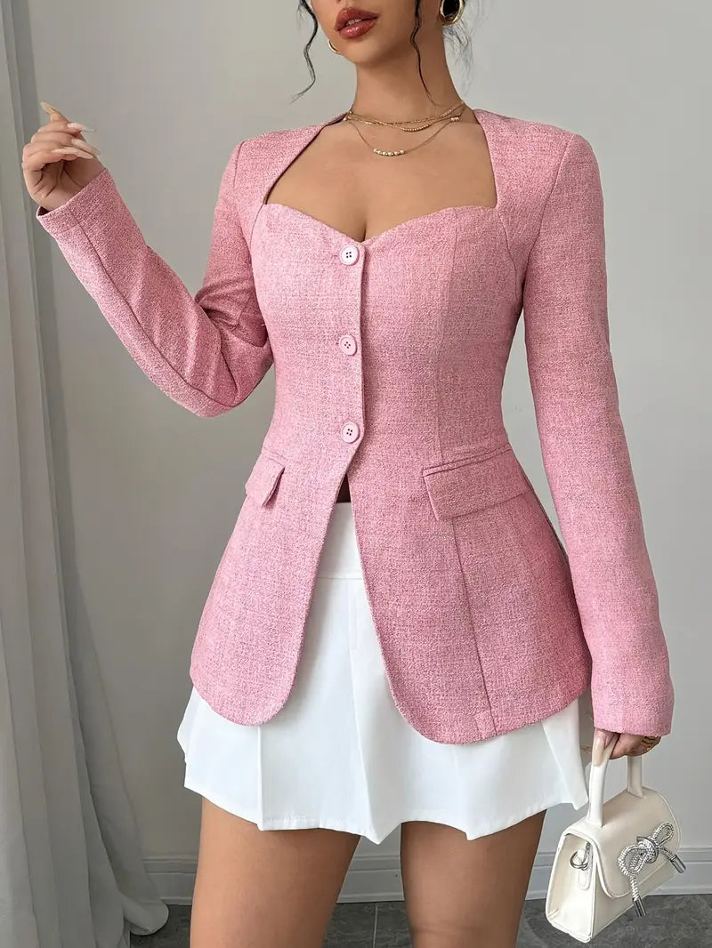 Denne knappede jakken fremhever silhuetten med sin figursydde passform og moderne firkantede hals. Perfekt for en elegant og feminin stil, den kan brukes både på kontoret og på utflukt. Dens nøye design og delikate knapper gir et tidløst preg av raffinement til antrekket ditt.
