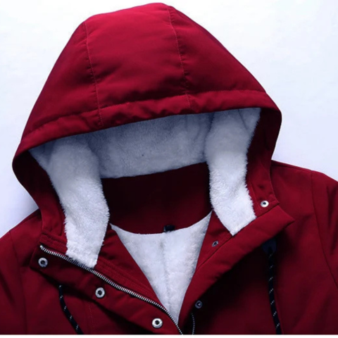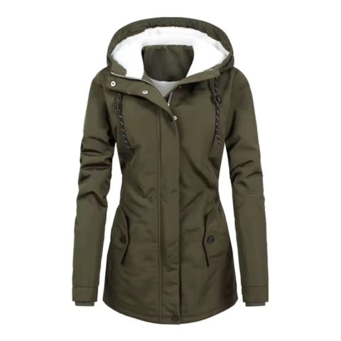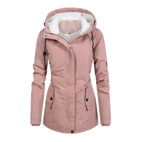 Xavia | Długa, przytulna kurtka damska — z kapturem i kontrastową podszewką